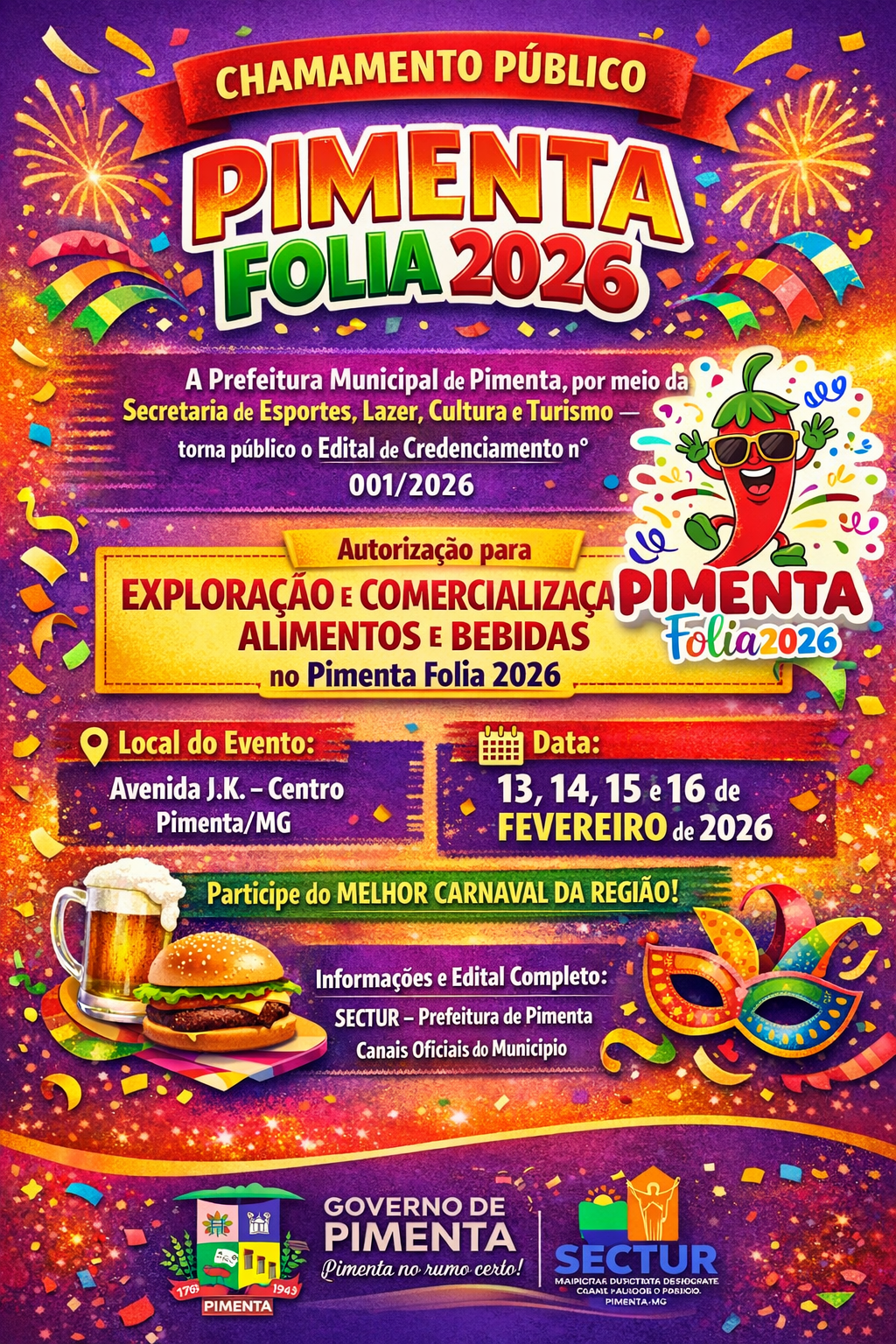 A Prefeitura Municipal de Pimenta, por meio da Secretaria Municipal de Esportes, Lazer, Cultura e Turismo – SECTUR, torna público o Edital de Credenciamento nº 001/2026, destinado na autorização de uso de espaço público para fins de exploração e comercialização de alimenta e bebidas no espaço Pimenta Folia 2025, que acontecerá na Avenida J.K nos […]