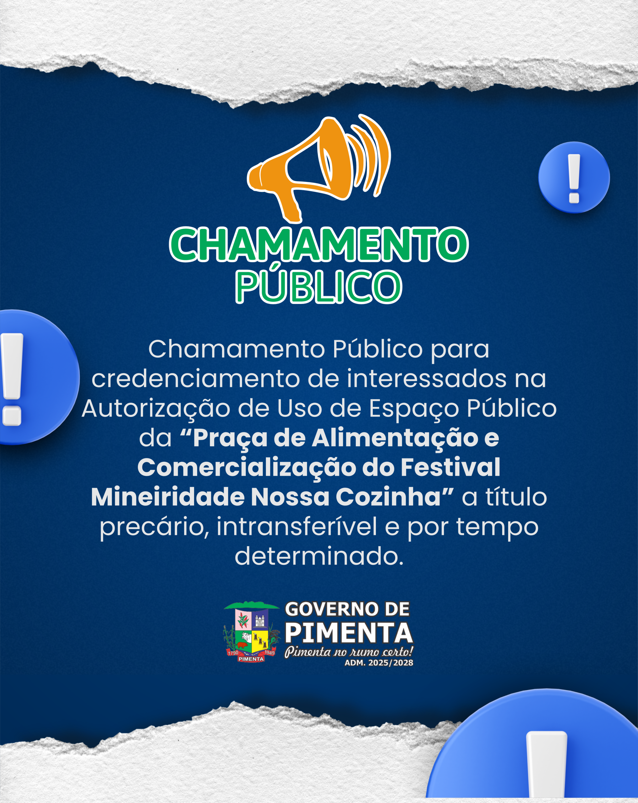 A Prefeitura Municipal de Pimenta, por meio da Secretaria Municipal de Esportes, Lazer, Cultura e Turismo – SECTUR, torna público o Edital de Credenciamento nº02/2025, Interessados na Autorização de Uso de Espaço Público da “Praça de Alimentação e Comercialização do Festival Mineiridade Nossa Cozinha” a título precário, intransferível e por tempo determinado. 📌 Cronograma:✅ Expedição […]