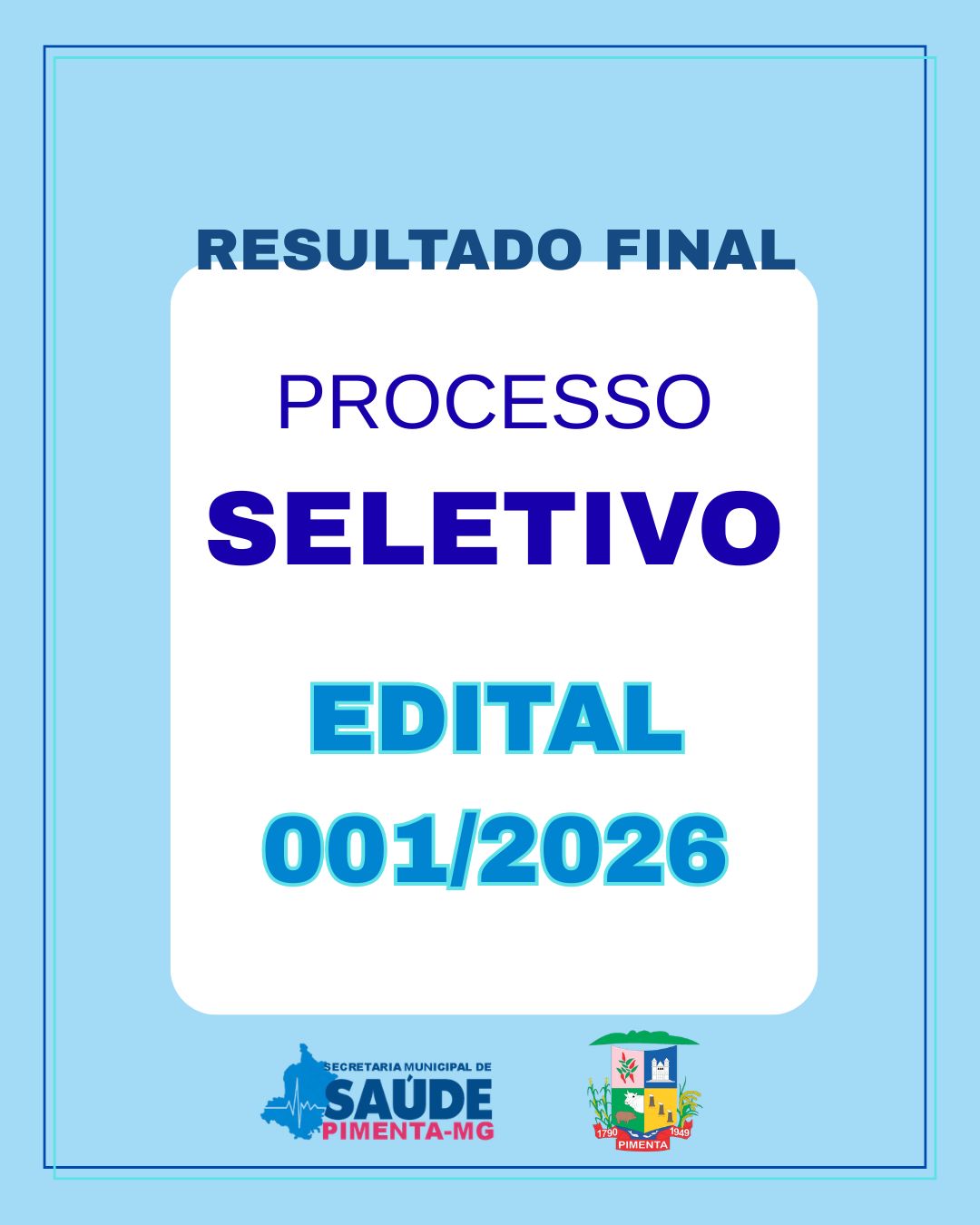 A Prefeitura Municipal de Pimenta, por intermédio da Secretaria Municipal de Saúde, torna público o Resultado Final do Processo Seletivo Simplificado, regido pelo Edital nº 001/2026, destinado à contratação de profissional para o cargo de Odontólogo, bem como à formação de cadastro de reserva.